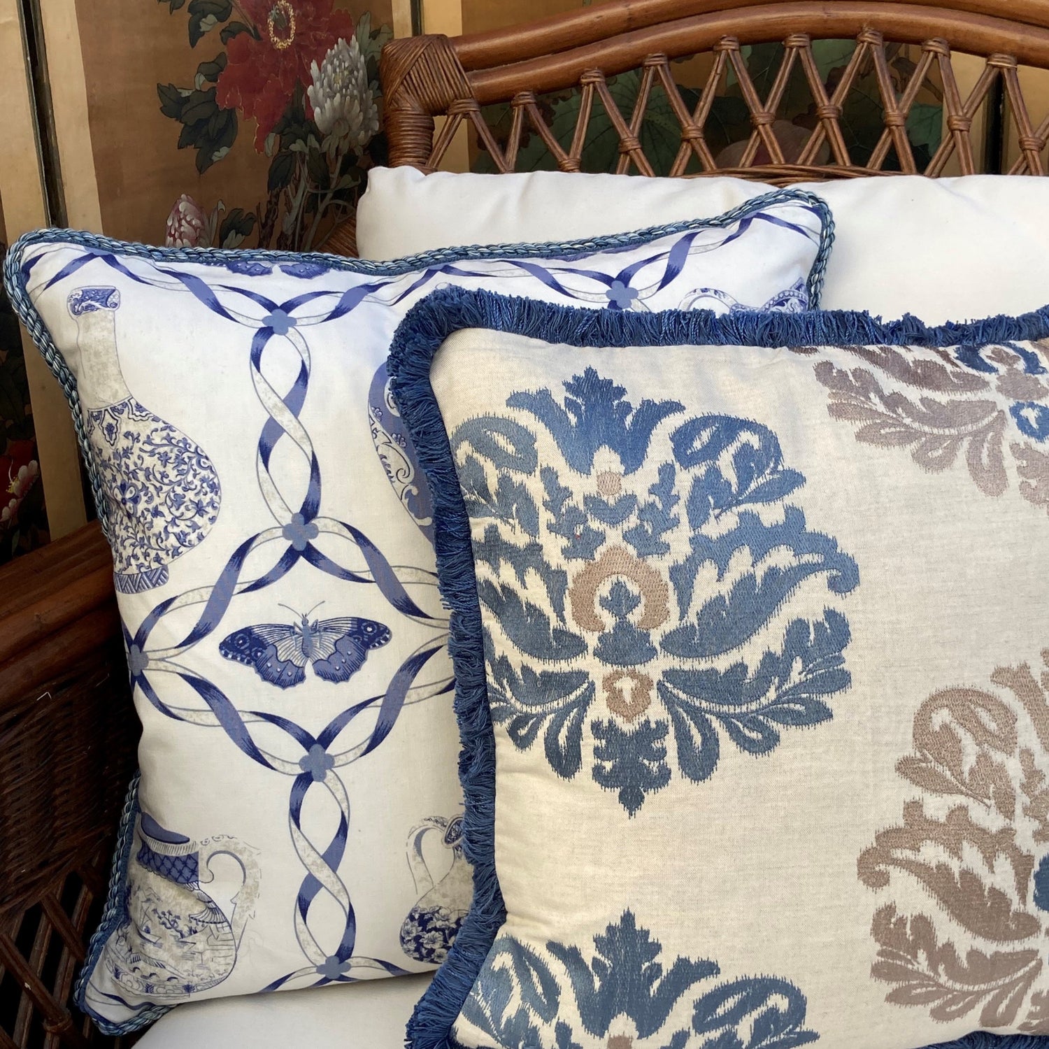 A distinctive print from Spanish design firm Cres Munoz features shades of French blue and white pottery detailed in taupe, on an off-white ground, outlined in squares of the same French blue ribbon with blue butterflies at the intersections. Very pretty and fresh, the reverse maintains the mood with taupe linen with off-white stripes. Soft blue rope unites the two sides.